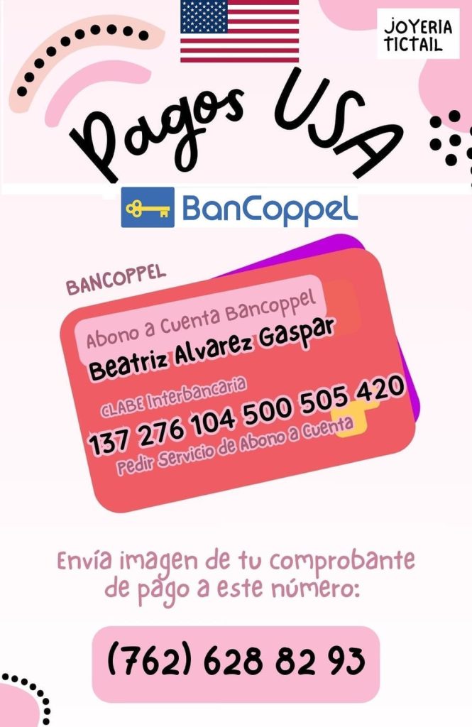 - Datos bancarios para pagos desde Estados Unidos:Servicio de Deposito a Cuenta Bancoppel Beatriz Alvarez Gaspar Clabe 137 276 104 500 505 420