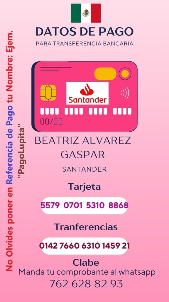 - Datos bancarios para pagos en México:Banco: Santander Nombre: Beatriz Alvarez Gaspar Tarjeta Numero 5579 0701 5310 8868 En referencia de pago: pon tu Nombre: pago de Lupita Gonzales